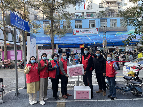 廣東燦城農產品集團有限公司創始人林育英女士看在眼里疼在心里,2月27日下午15:00-16:00,連著幾天在林育英女士帶領下,燦城同事前往龍崗區坂田街道、四季花城社區、萬科城哥倫布廣場檢測點、萬科城南門檢測點、中海日輝臺(貝爾路地鐵 A出口)檢測點等二十余個檢測點派送愛心湯圓,給各站點防疫工作人員送上溫暖。