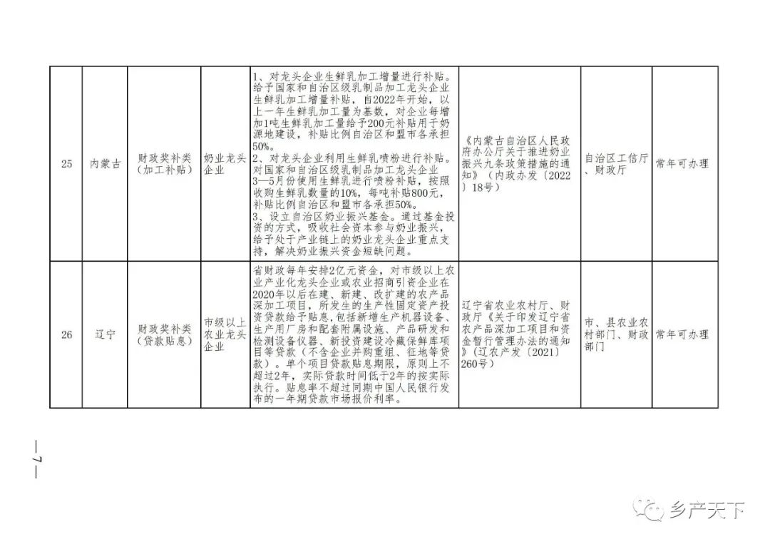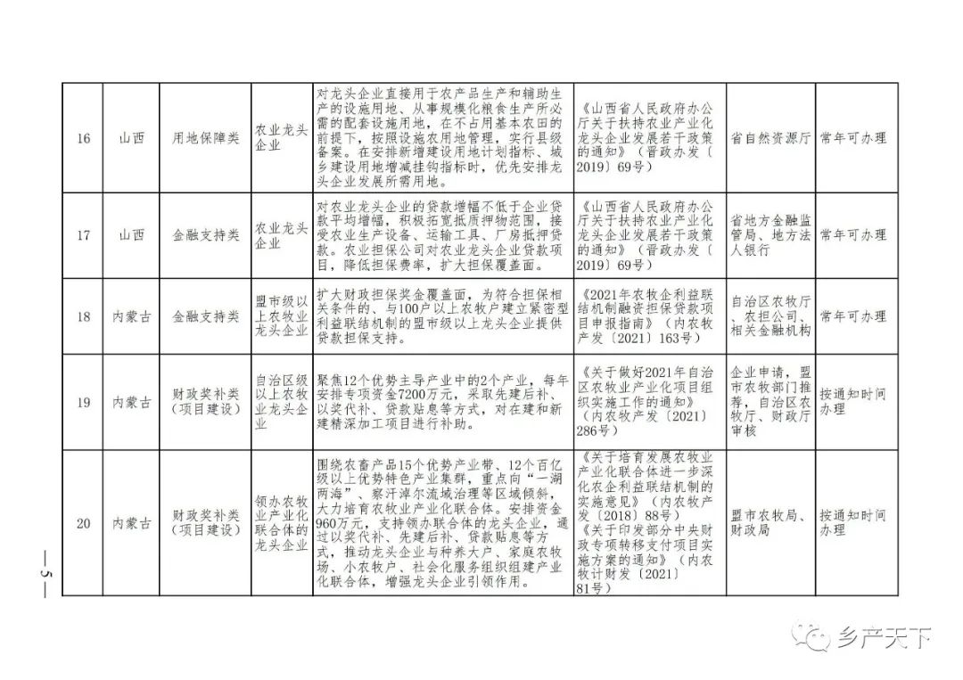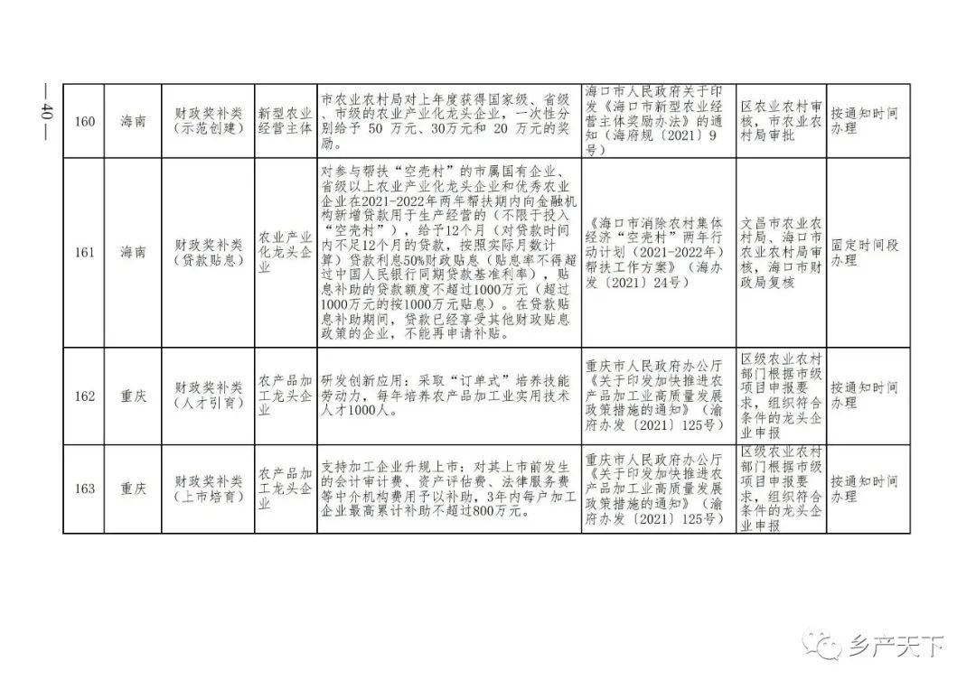 為加強對農(nóng)業(yè)產(chǎn)業(yè)化龍頭企業(yè)的精準服務,農(nóng)業(yè)農(nóng)村部鄉(xiāng)村產(chǎn)業(yè)發(fā)展司收集了各省(區(qū)、市)對龍頭企業(yè)的支持政策,于近期印發(fā)《農(nóng)業(yè)產(chǎn)業(yè)化龍頭企業(yè)支持政策清單》(簡稱《清單》),供各地互相參考學習。