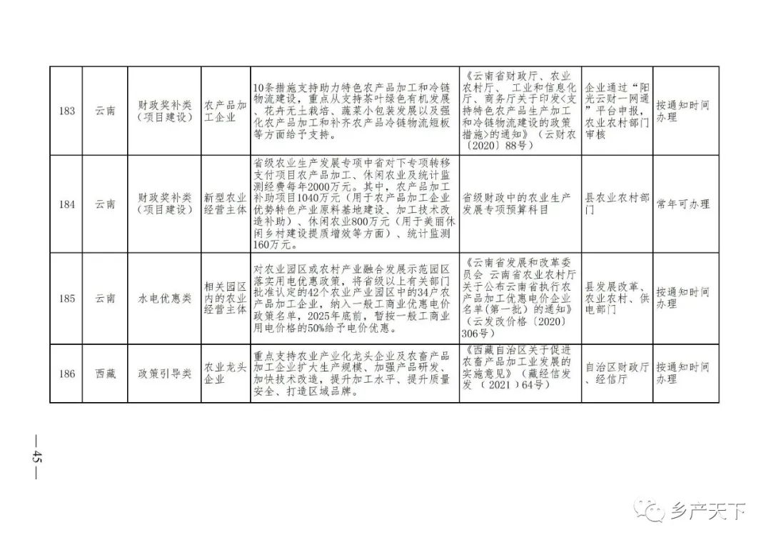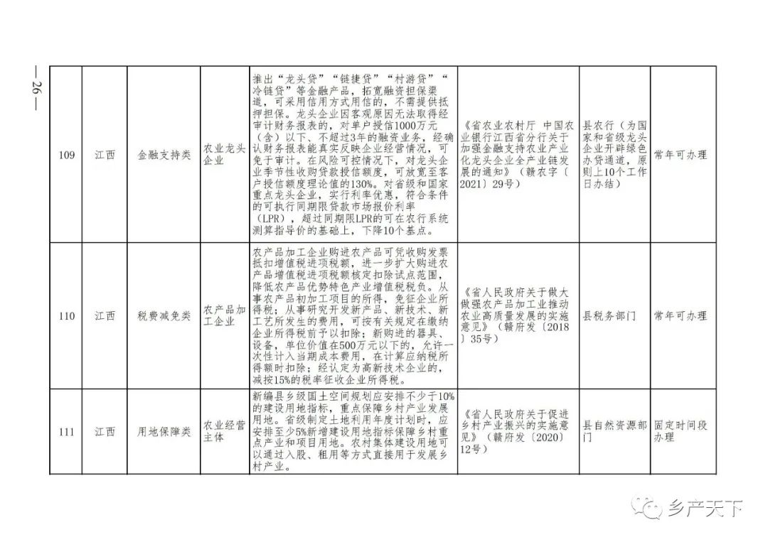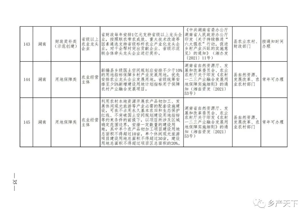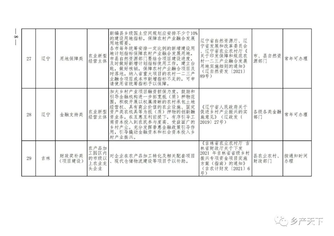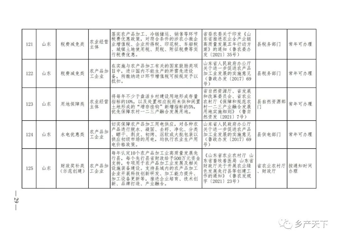 《清單》按照“政策類別、支持對象、具體內(nèi)容、政策依據(jù)、辦理部門、辦理時間”進行梳理,共涉及“財政獎補、金融支持、用地保障、稅費減免、水電優(yōu)惠、政策引導”等六大類229條政策。《清單》通知,各地支持政策發(fā)生變化,要及時反饋,鄉(xiāng)村產(chǎn)業(yè)發(fā)展司將定期更新發(fā)布。