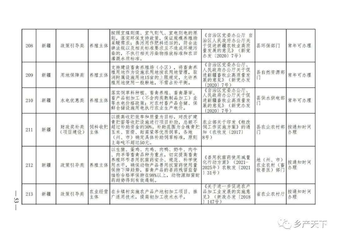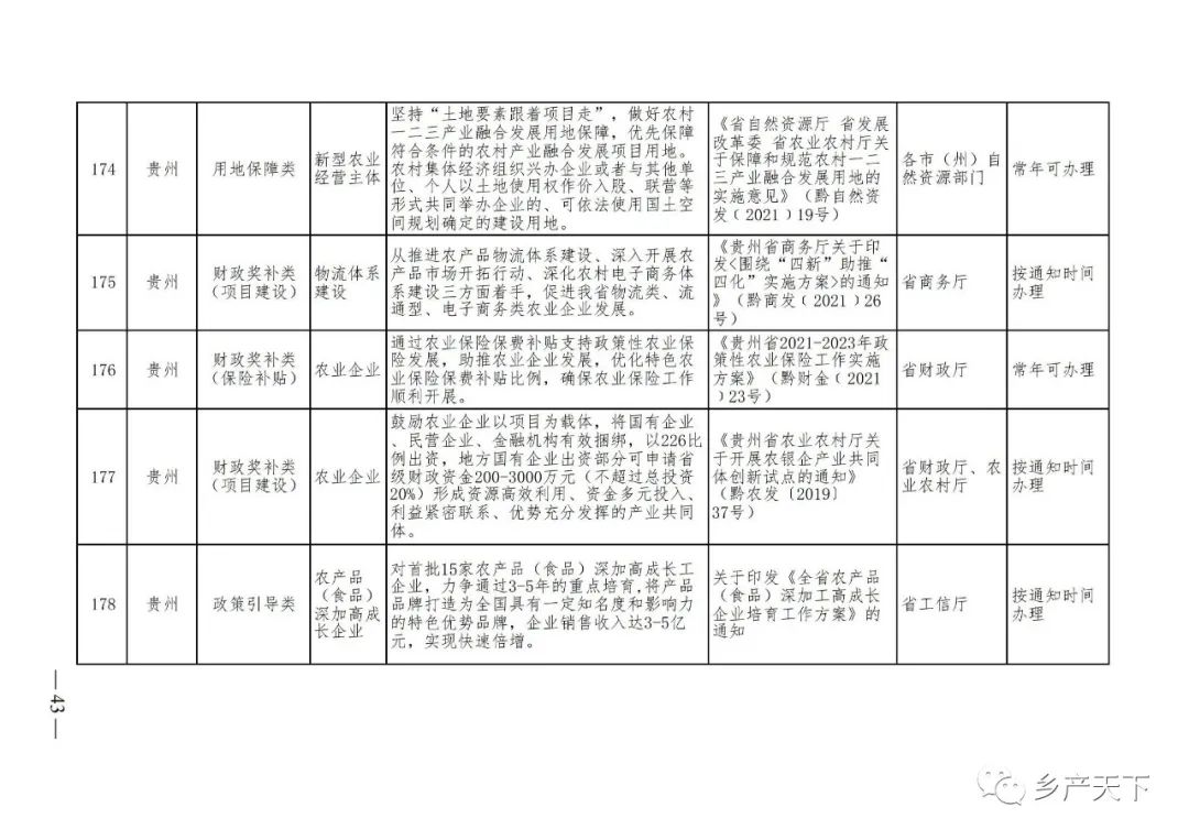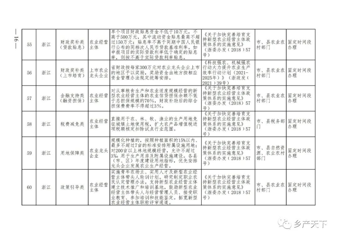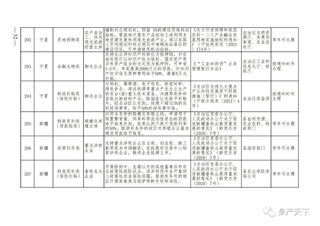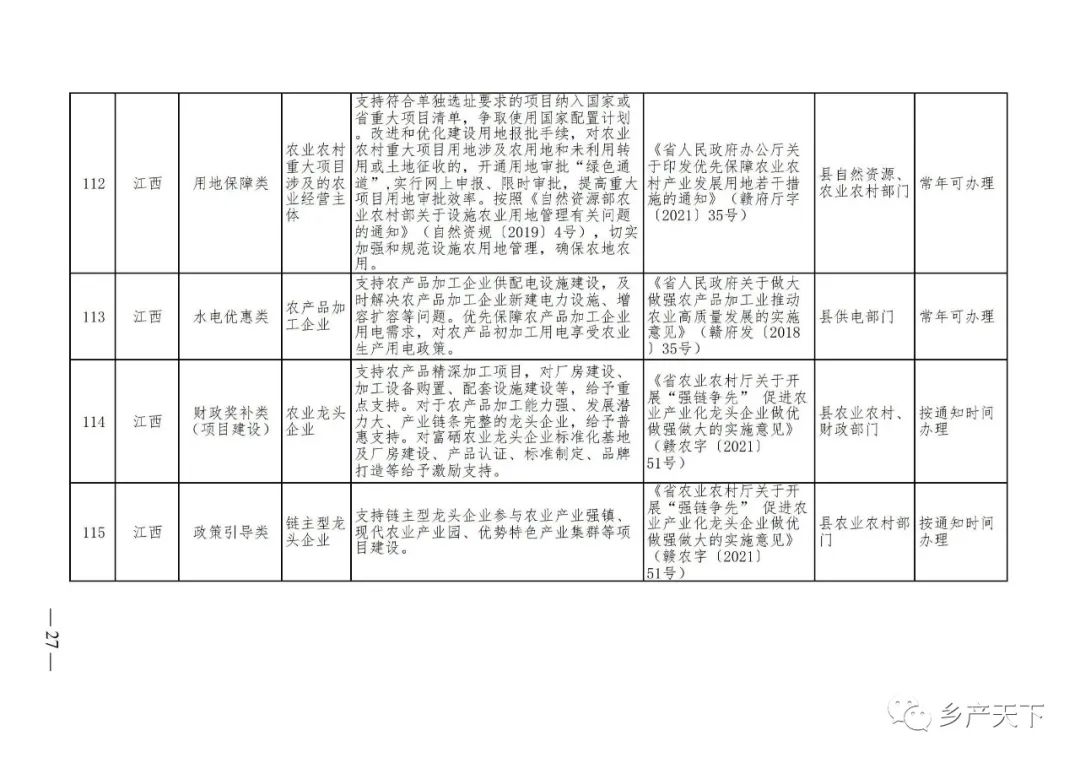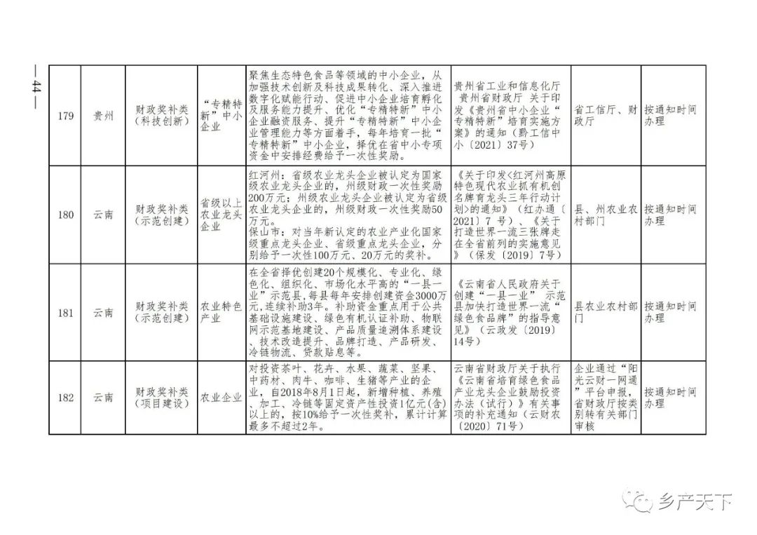 《清單》按照“政策類別、支持對象、具體內(nèi)容、政策依據(jù)、辦理部門、辦理時間”進行梳理,共涉及“財政獎補、金融支持、用地保障、稅費減免、水電優(yōu)惠、政策引導”等六大類229條政策。《清單》通知,各地支持政策發(fā)生變化,要及時反饋,鄉(xiāng)村產(chǎn)業(yè)發(fā)展司將定期更新發(fā)布。